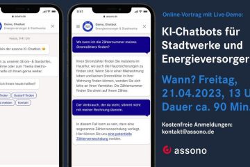 Am 21. April um 13 Uhr haben wir einen Online-Austausch zum Thema „Nutzen von KI-Chatbots für Stadtwerke und Energieversorger“ geplant. In dem kostenlosen Zoom-Meeting sprechen unsere Chatbot-Experten mit Ihnen über die Vorteile eines KI-Chatbots für Stadtwerke und Energieversorger, teilen Erfahrungswerte aus der Praxis und zeigen Ihnen eine Live-Demo. „Wie setzen Weiterlesen…